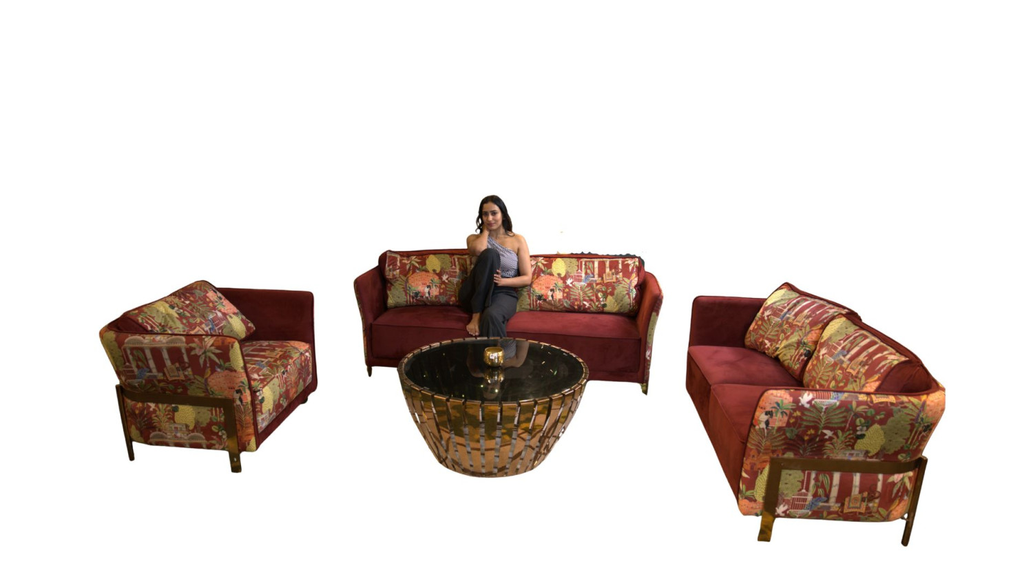 Frame Work : Solid wood (American teak/ steam beach) Ply wood : 710 grade gurjan 100% foam : premium density & reliance as per design upholstery : printed fabric with suade fabric Steel SS 304 grade with pvd finish rosegold